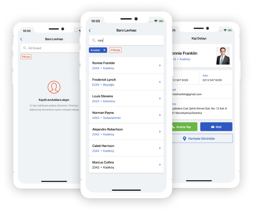 Baro Levhasına kayıtlı avukatların harita üzerinde adres bilgilerine telefon ve mail
